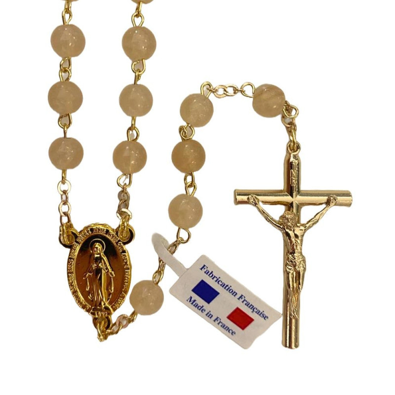 Découvrez l'élégance et la sérénité incarnées dans ce chapelet en aragonite jaune. Monté sur une chaîne et un fil dorés, il promet une tenue solide et un éclat durable. Chaque perle d'aragonite, d'un jaune chaleureux, a été soigneusement sélectionnée pour sa qualité et taillée en forme ronde avec un diamètre de 6mm. Parfait pour la méditation personnelle ou comme cadeau spirituel, ce chapelet est un hommage à la beauté de la tradition catholique.