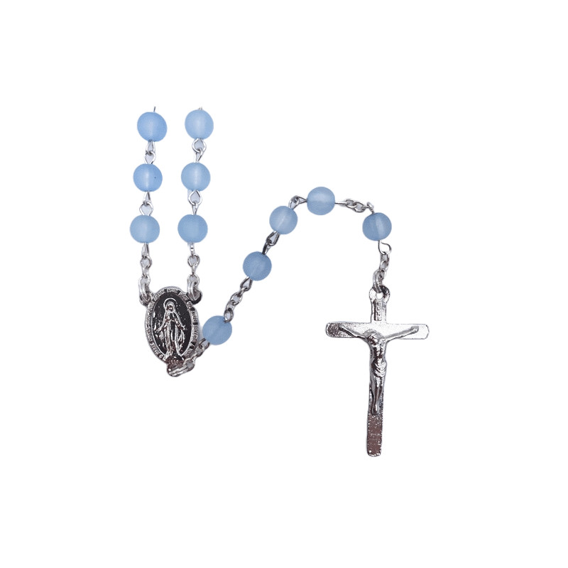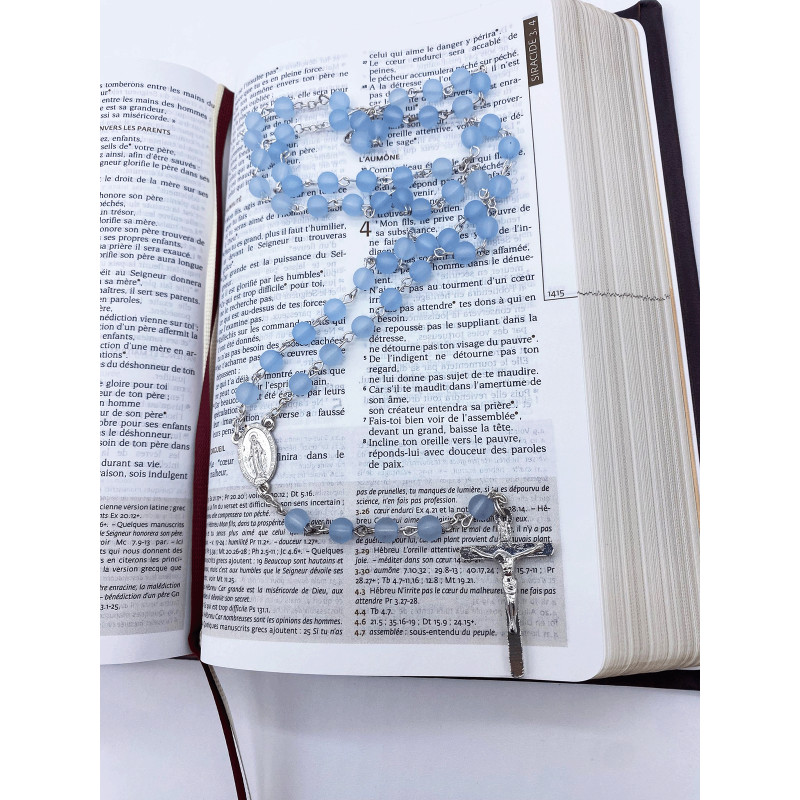 Ce chapelet est monté sur chaine et fil argenté. Les perles sont en plastique bleu sablé.