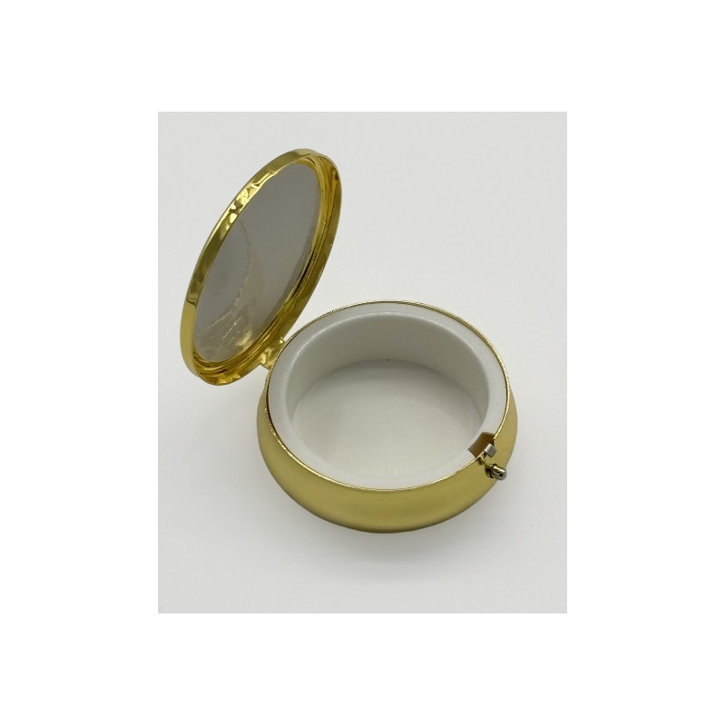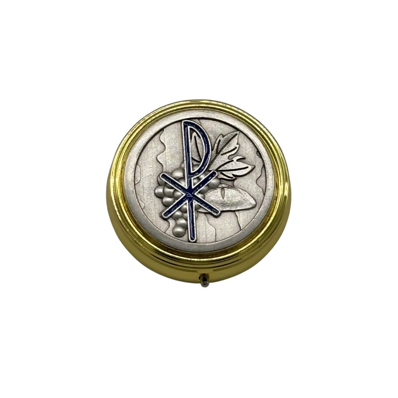 Superbe custode en métal doré, et décorée à la main avec de l'émail bleu. Elle permet d'apporter les hosties aux personnes qui ne peuvent se déplacer à l'église.