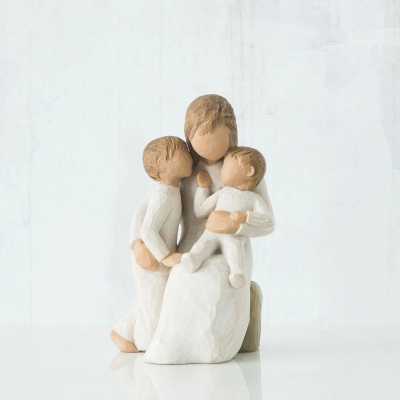 La figurine « Vierge - Quietly » de la collection Willow Tree, imaginée par l’artiste Susan Lordi, rend hommage à la grâce silencieuse et à la tendresse infinie de la maternité. Elle représente une femme assise, vêtue d’une robe sobre et claire, tenant deux jeunes enfants contre elle. L’un repose calmement sur ses genoux, tandis que l’autre est blotti à ses côtés, en quête de réconfort.