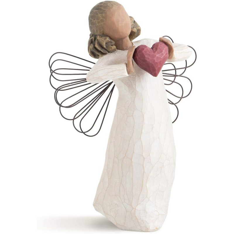 La figurine « Avec Amour » de la collection Willow Tree, créée par l'artiste Susan Lordi, incarne l'expression pure de l'amour et de l'affection. Cette sculpture représente un ange debout, vêtu d'une robe crème, tenant délicatement un cœur rouge entre ses mains, symbolisant l'amour offert sans condition.