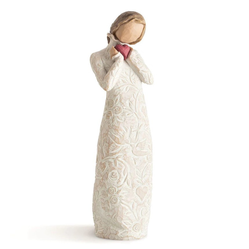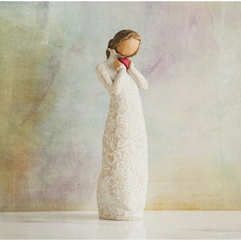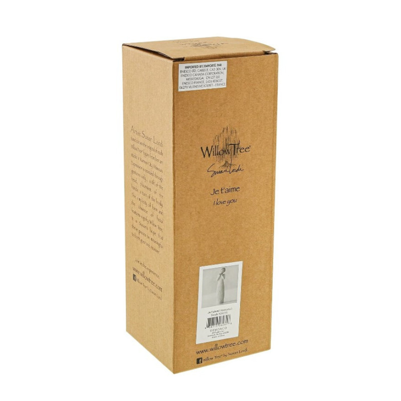 La figurine « I Love You » de la collection Willow Tree, conçue par l'artiste Susan Lordi, incarne l'expression simple et sincère de l'amour. Cette sculpture représente une femme debout, vêtue d'une robe crème, tenant un cercle en fil doré dans lequel est inscrit "love you", symbolisant un message d'affection universel.