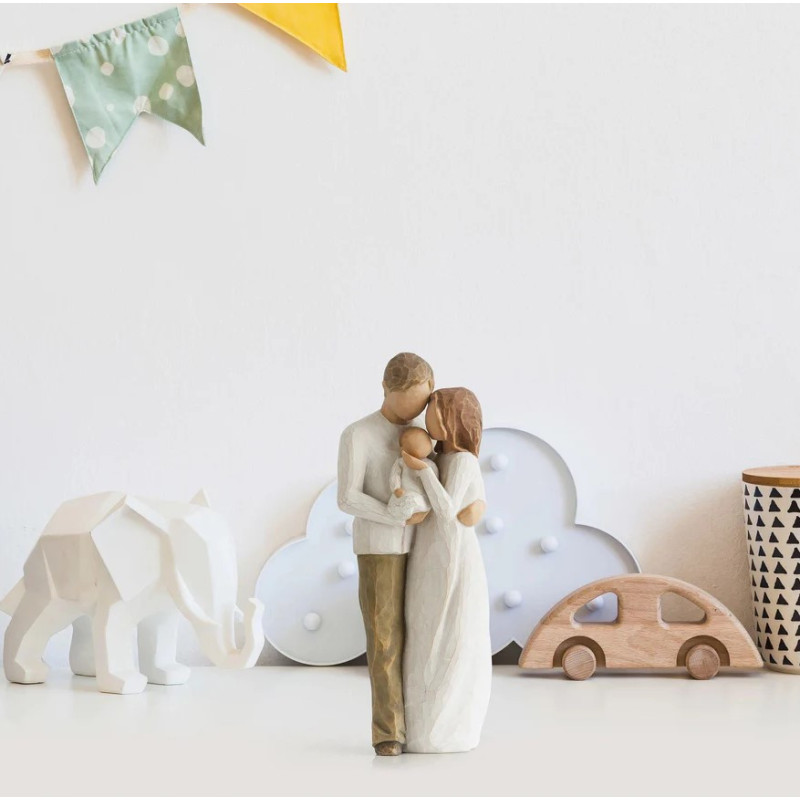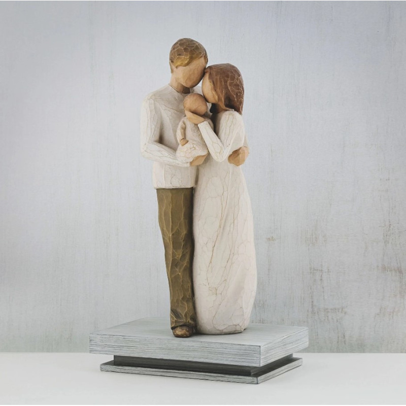 La figurine « Notre Présent » de la collection Willow Tree, conçue par l'artiste Susan Lordi, incarne la tendresse et la joie entourant l'arrivée d'un enfant. Cette sculpture représente un couple assis, tenant leur nouveau-né dans une étreinte chaleureuse, symbolisant l'amour inconditionnel et le lien familial profond.