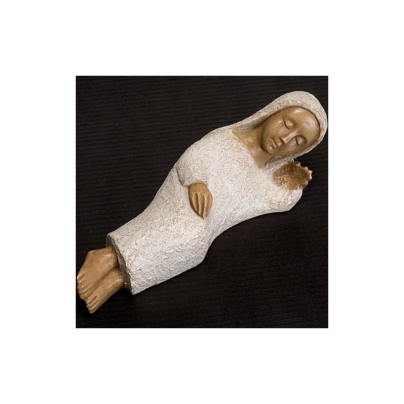 Santon "Marie" de la crèche des Soeurs de Bethleem, réalisé en pierre naturelle : la dolomie. Les finitions blanches et dorées sont faites à la main par des soeurs. Sa taille est de 18cm.