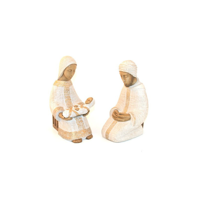 Les santons de cette crèche de Noël, création artisanale des Soeurs de Bethleem mesurent 27cm. L'enfant Jésus mesure 13 cm. Les finitions blanches et dorées sont faites à la main.