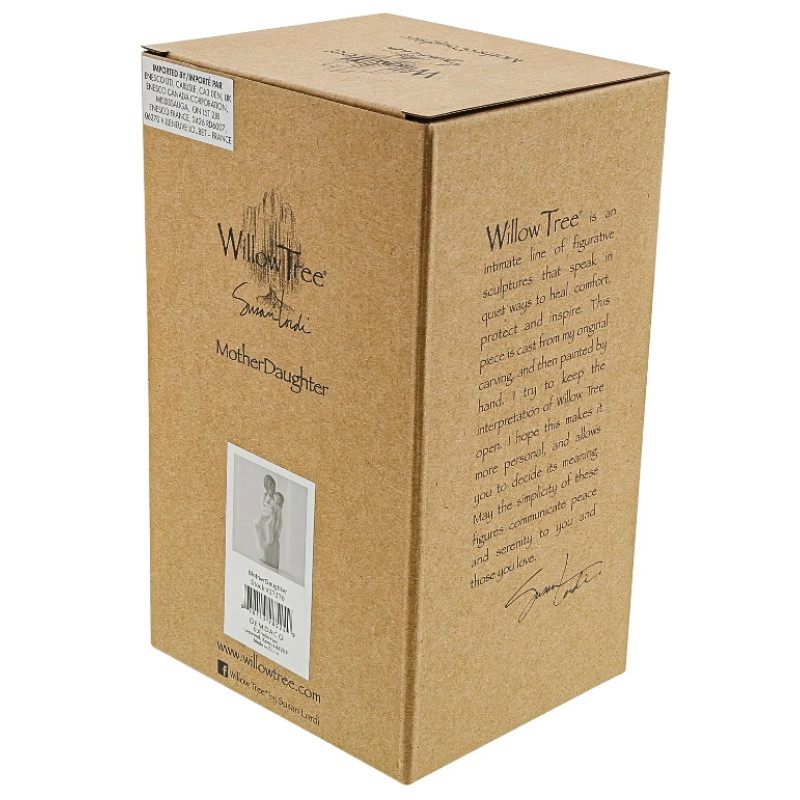 La figurine « Mère et Fille » de la collection Willow Tree, conçue par l'artiste Susan Lordi, incarne la tendresse et la complicité entre une mère et sa fille. Cette sculpture représente une mère assise, vêtue d'une robe crème, tenant tendrement sa fille sur ses genoux, symbolisant l'amour, la protection et le lien affectif qui les unit.