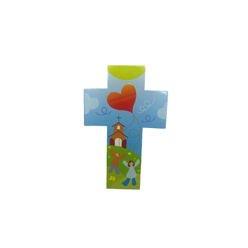Cette croix murale représente deux enfants s’amusant à tirer un cerf-volant en forme de cœur, symbole de l’amour, de la joie et de l’innocence. En arrière-plan, une église lumineuse, portes ouvertes rappelle la présence divine et l’importance de la foi dès le plus jeune âge.