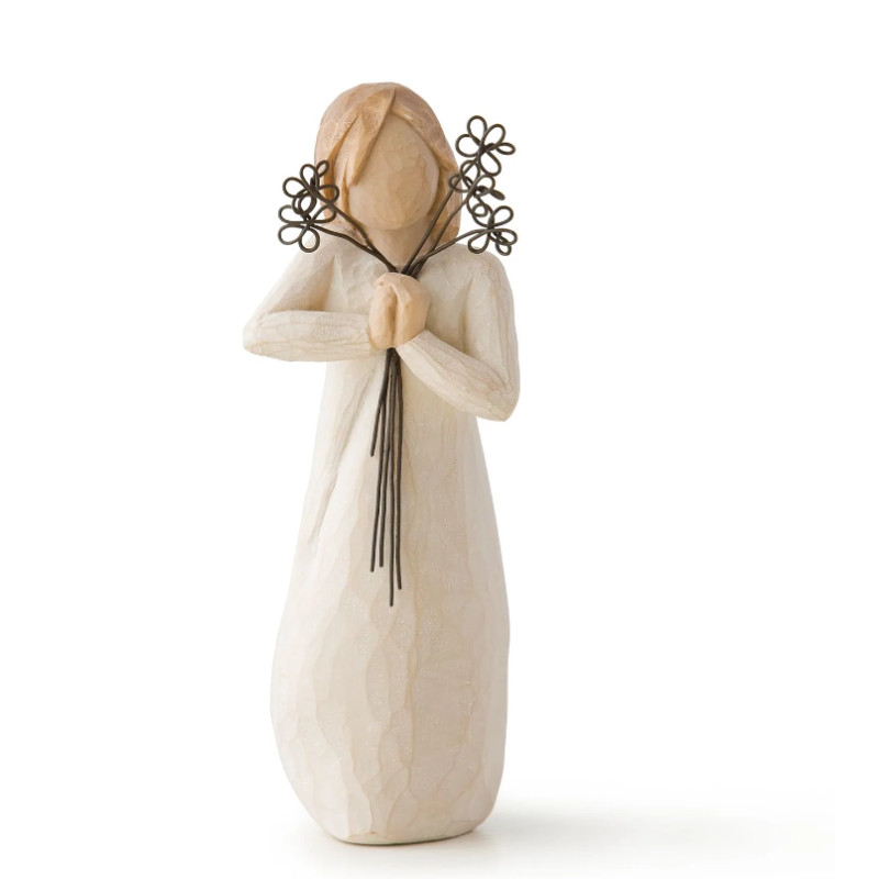La figurine « Amitié » de la collection Willow Tree, conçue par l'artiste Susan Lordi, incarne la beauté et la force des liens amicaux. Cette sculpture représente une femme debout, vêtue d'une robe crème, tenant devant elle cinq fleurs en fil métallique, symbolisant la diversité et la richesse des relations d'amitié.
