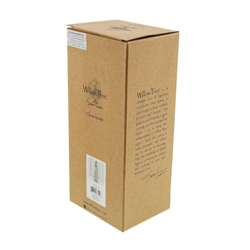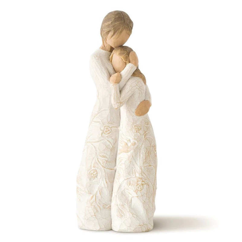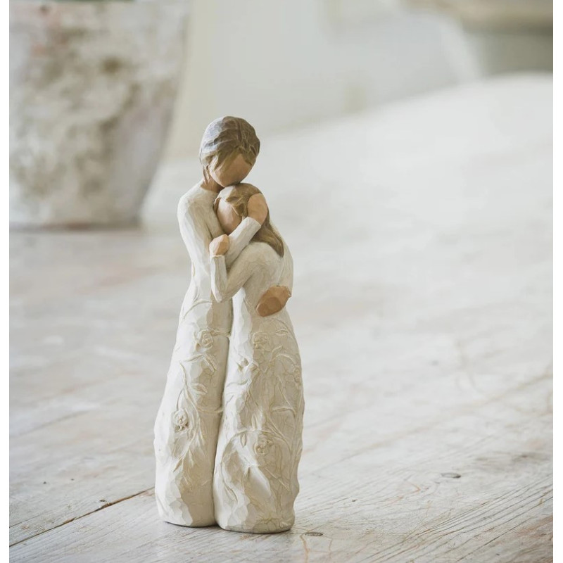 La figurine « Close to Me » de la collection Willow Tree, conçue par l'artiste Susan Lordi, incarne la tendresse et la complicité entre une mère et sa fille. Cette sculpture représente une femme embrassant affectueusement une jeune fille, toutes deux vêtues de robes crème ornées de motifs entrelacés de vignes et d'oiseaux en vol, symbolisant l'amour, la liberté et la connexion profonde.