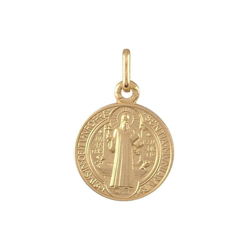 Magnifique médaille de Saint Benoit, en plaqué or véritable. Cette médaille, fabriquée dans des ateliers en France, mesure 18 mm de diamètre.