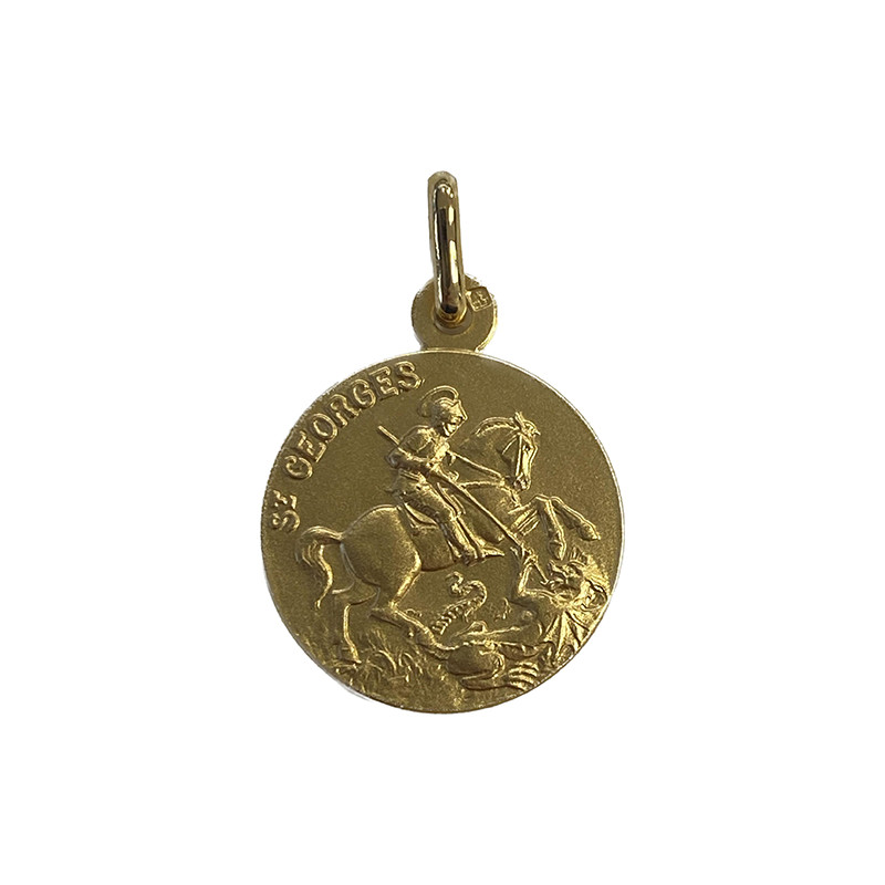 Magnifique médaille de Saint Georges en plaqué or véritable. Cette médaille, fabriquée dans des ateliers en France, mesure 18 mm de diamètre.