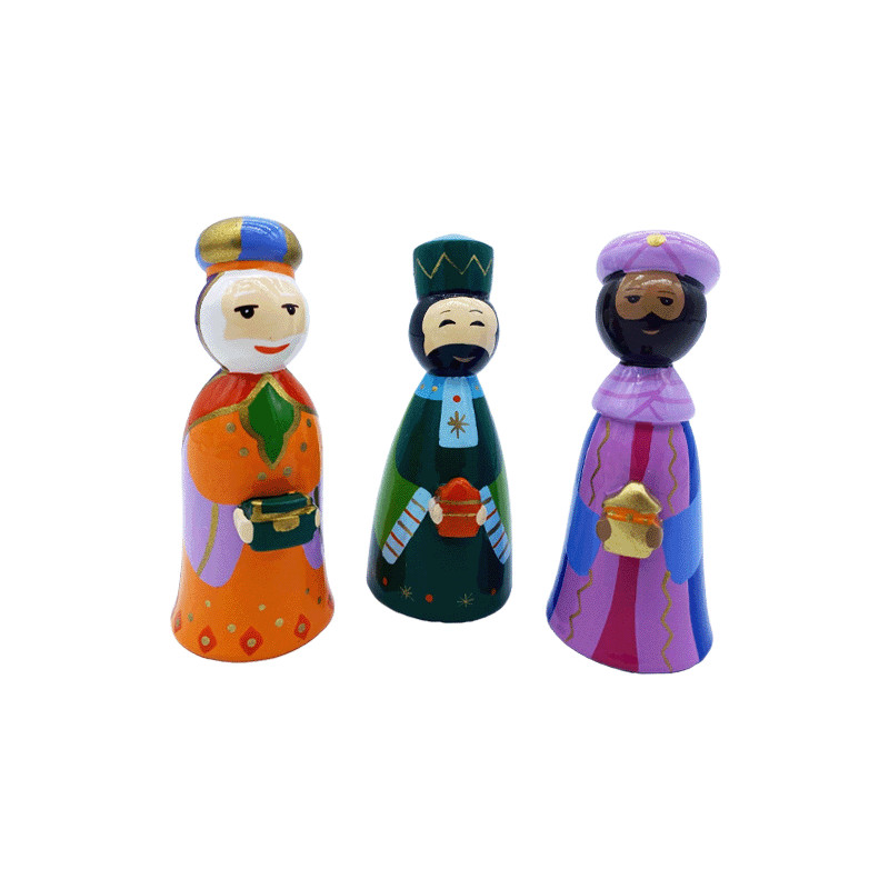Les santons en bois décoré de cette crèche de Noël sont les 3 rois mages. Ces santons de l'épiphanie sont Melchior, Gaspard et Balthazar. Cette crèche de Noël est fabriquée par un atelier solidaire, implanté aux Philippines, qui permet ainsi l'insertion des femmes dans la vie professionnelle. La taille de ces santons est de environ 10 cm.