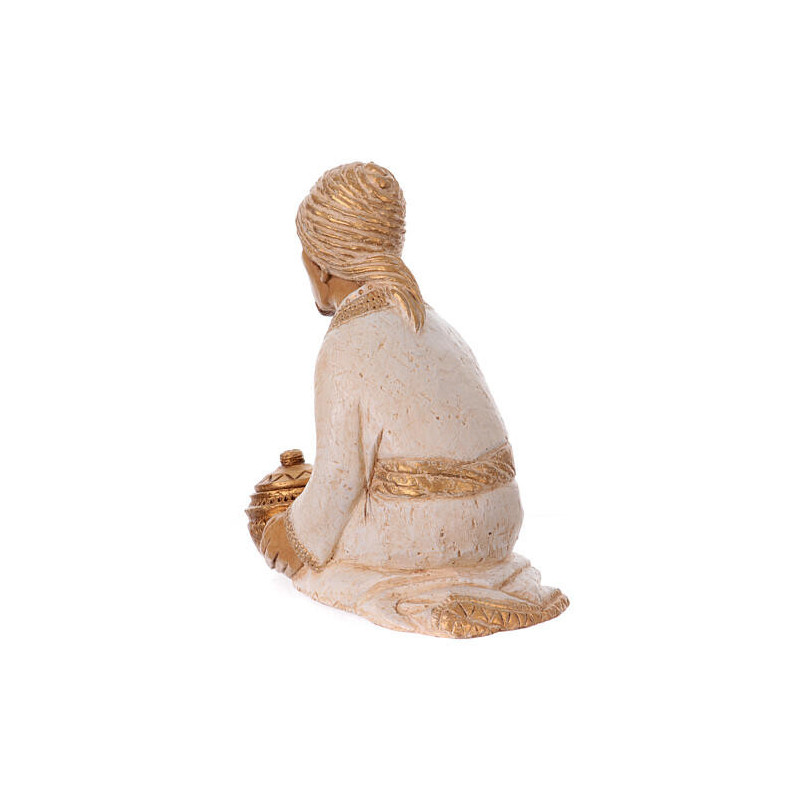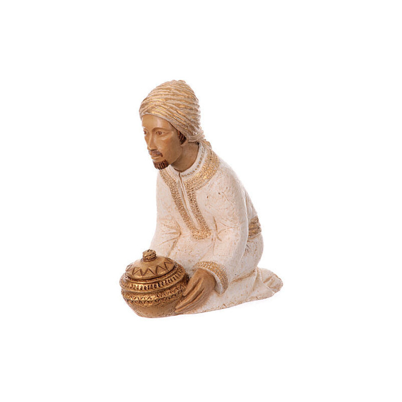 Magnifique Roi mage "Gaspard", réalisé en pierre naturelle: la dolomie. Cette création artisanale des soeurs de Bethleem mesure 23cm. Les finitions blanches et dorées sont faites à la main. Le couvercle du coffre est amovible.