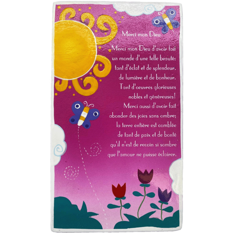 Cette plaquette en bois dont les dimensions sont 8,5x15 cms est un joli cadre en bois sur lequel est peint à la main la prière "Merci mon Dieu".
