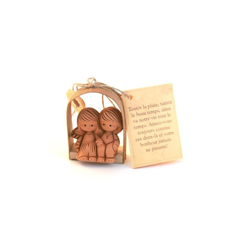 Porte Bonheur anges gardien duo. Magnifique duo d'anges en terre cuite. Ce duo d'anges fabriqué en terre cuite artisanale est à poser ou à suspendre comme "porte bonheur". La taille de cet ensemble d'angelots est de 8cm. Un certificat d'appartenance est également fourni, ce qui vous permettra de personnaliser ce cadeau religieux.