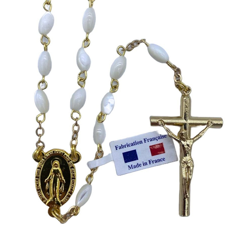 Fabriqué avec soin en France dans nos ateliers, cet objet de dévotion allie tradition et élégance. Les perles de nacre authentique, taillées en forme d'olive, sont reliées par une chaîne et un fil dorés, lui conférant un éclat intemporel. La croix, centrée sur le Christ, est un rappel poignant de la foi chrétienne.