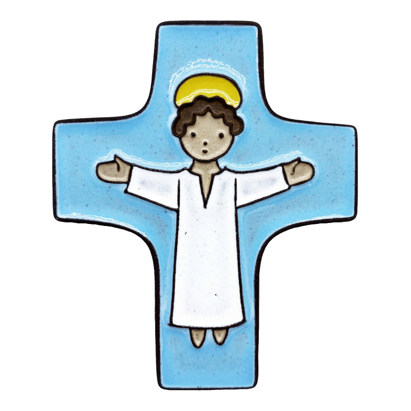 Croix Céramique "Christ Bras Ouverts" - Bleu Ciel