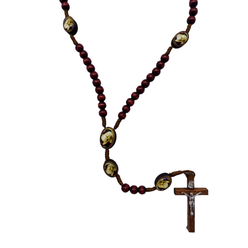 Chapelet réalisé avec en perles ovales de bois. Le coeur de ce chapelet est également à l'effigie de Sainte Rita.