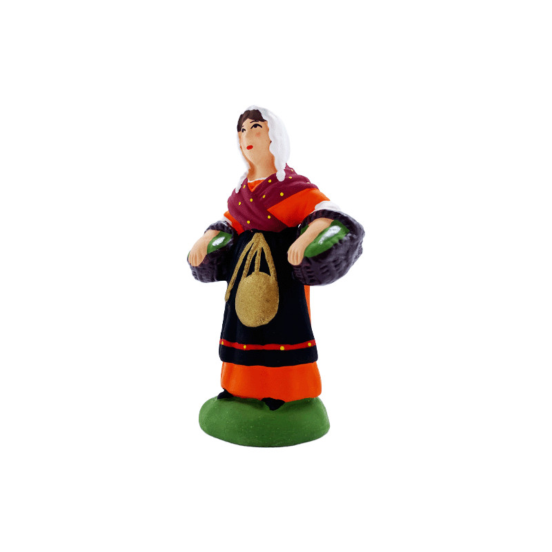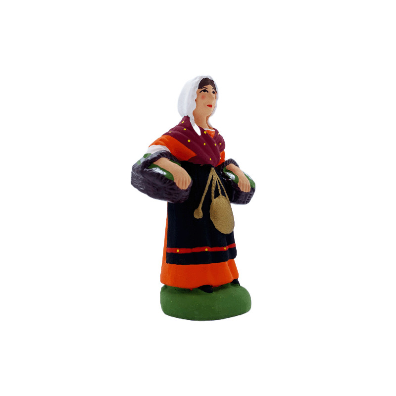 La poissonnière est un des personnages les plus anciens et les plus traditionnels de la vie provençale et de la crèche. Figure encore très pittoresque de nos jours en Provence. Femme de stature imposante et "forte en gueule" mais brave. Un grand fichu de couleur voyante, une coiffe de travail en coton blanc sur la tête, elle porte fièrement ses deux paniers remplis de poissons. Une balance romaine est attachée à sa ceinture.