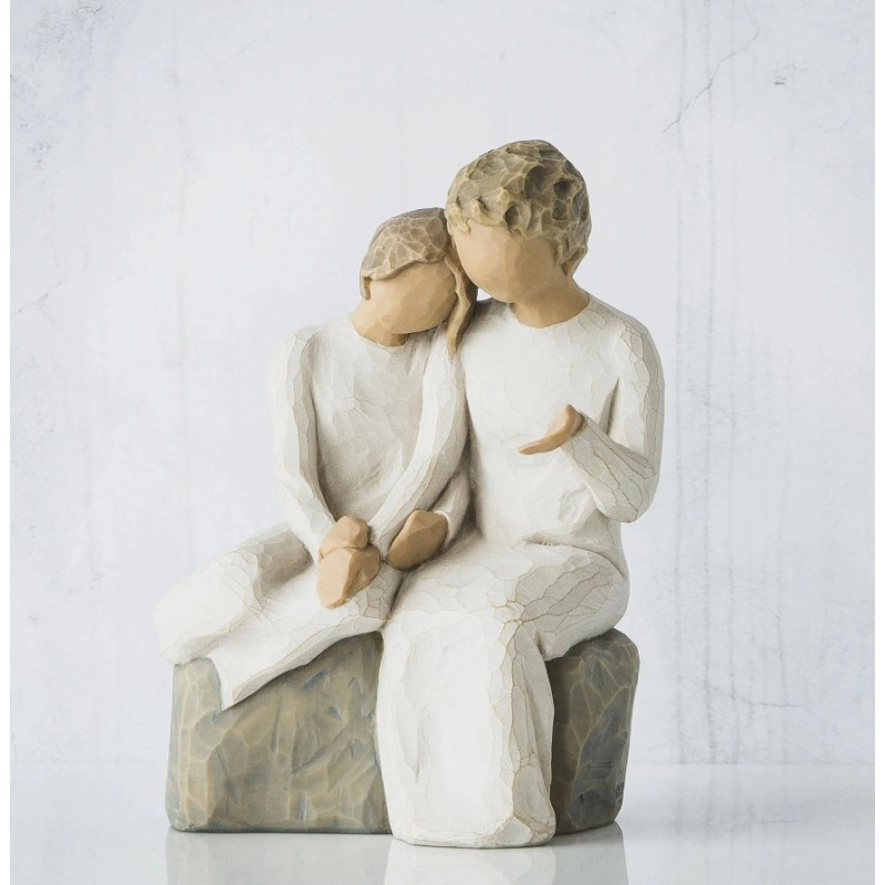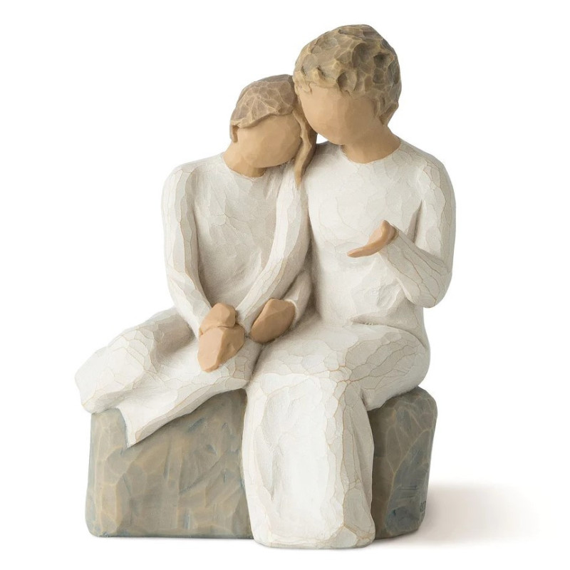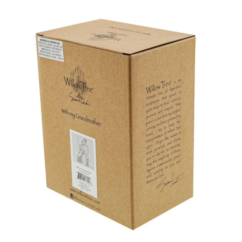 La figurine « Avec ma grand-mère » de la collection Willow Tree, conçue par l'artiste Susan Lordi, illustre avec tendresse la relation entre une grand-mère et sa petite-fille. Assises côte à côte sur un banc gris, elles se tiennent les mains, symbolisant la complicité, l'écoute et la transmission des souvenirs.