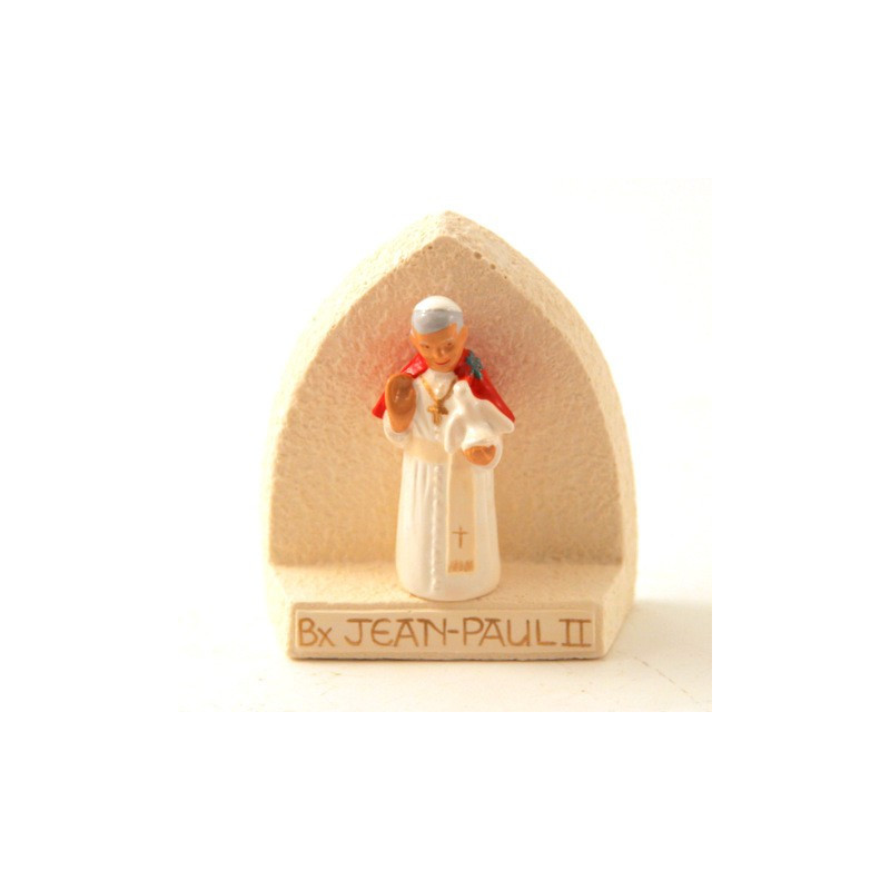 Découvrez notre statue cassegrain en bois, représentant le bienheureux Jean-Paul II, saint patron des familles, des jeunes, et des malades. Cet objet de dévotion, de 7 cm de hauteur, est idéal pour accompagner vos prières et méditations.
