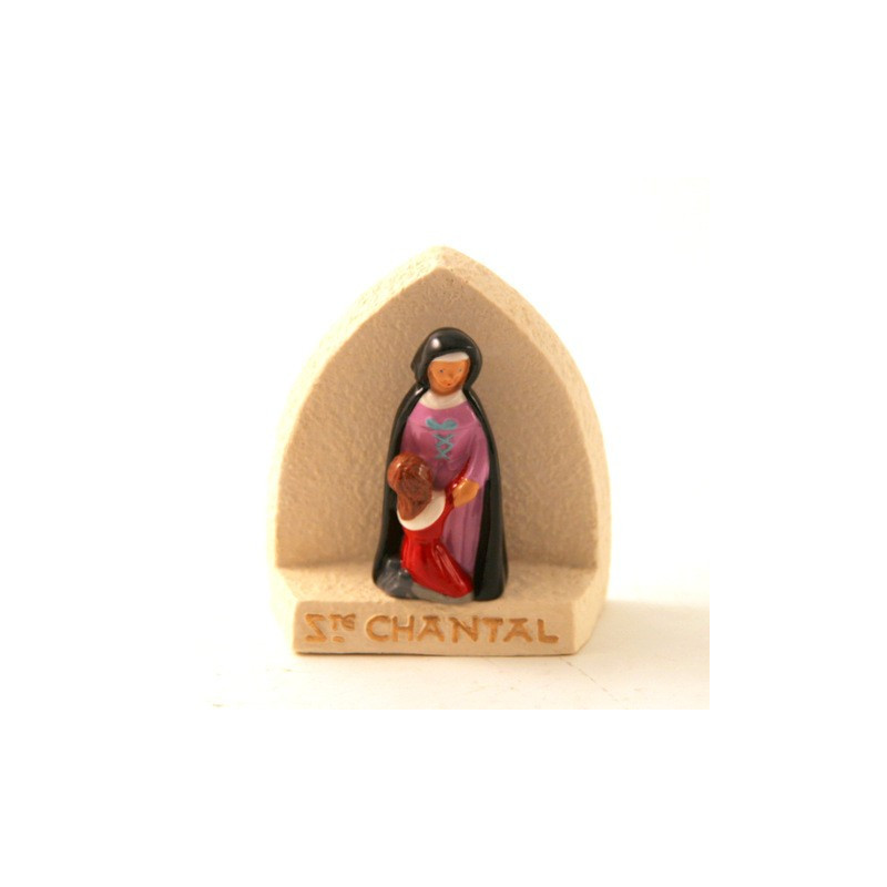 Cette statue de Saint Patron "Sainte Chantal" est réalisée en céramique emaillée, et est positionnée sur un socle en forme d'ogive fabriqué en poudre de marbre reconstitué.