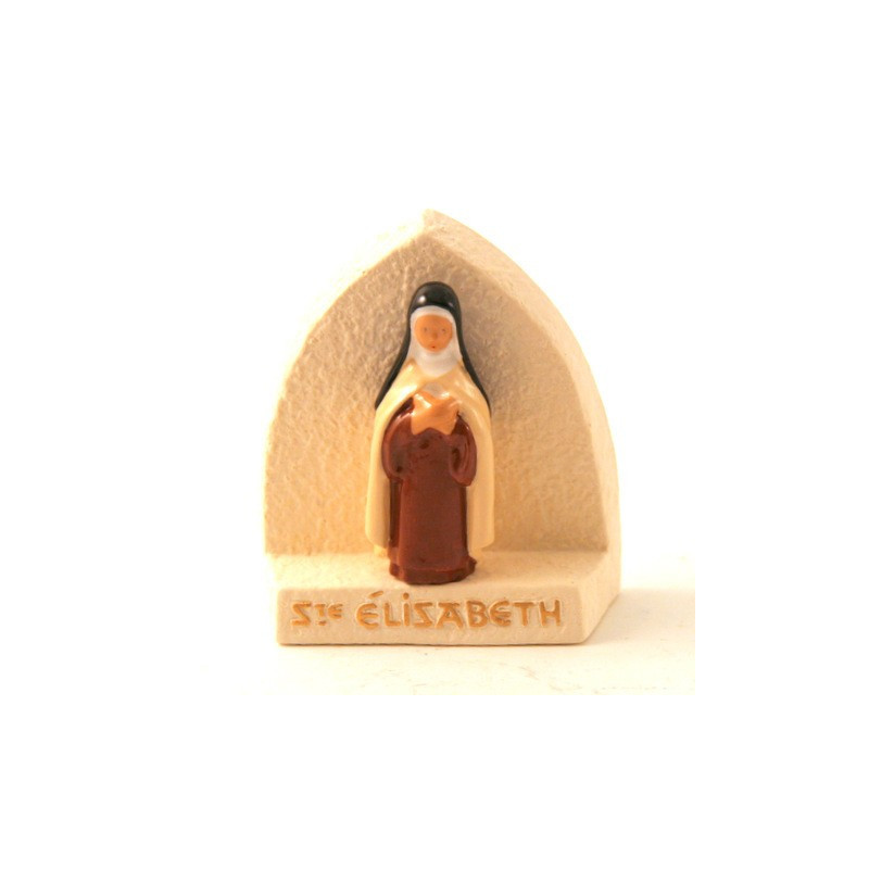 Cette statue de Saint Patron "Sainte Elisabeth" est réalisée en céramique emaillée, et est positionnée sur un socle en forme d'ogive fabriqué en poudre de marbre reconstitué.