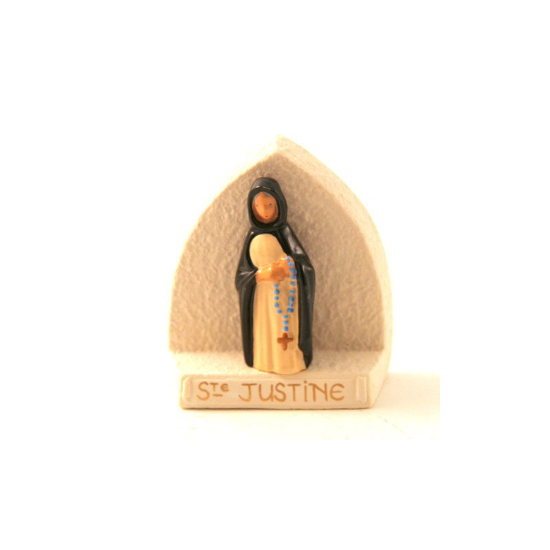 Cette statue de Saint Patron "Sainte Justine" est réalisée en céramique emaillée, et est positionnée sur un socle en forme d'ogive fabriqué en poudre de marbre reconstitué.