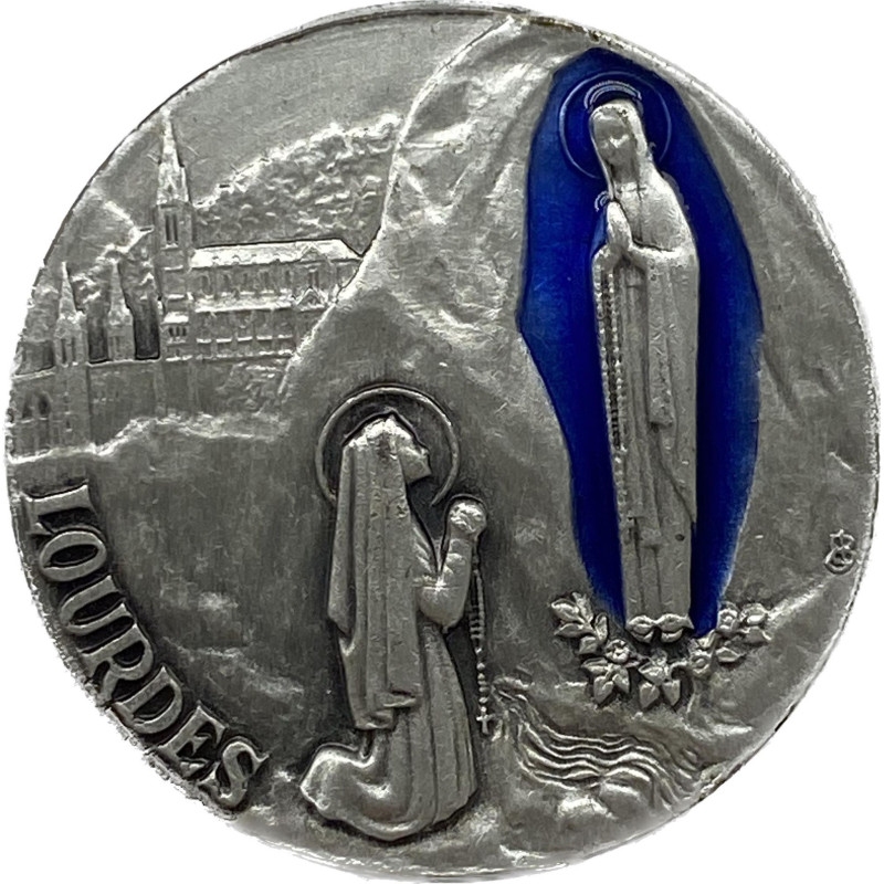 Cette plaque auto représente les apparitions de Lourdes de Notre Dame de Lourdes à la petite bergère Bernadette Soubirous ( Sainte Bernadette).