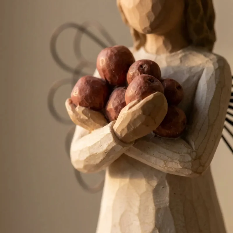 La statue Bonne Santé de Willow Tree, créée par Susan Lordi, incarne l'espoir et la guérison. Sculptée à la main en résine et peinte avec soin, elle mesure environ 13 cm de hauteur. L'ange en robe crème tient un bras rempli de pommes rouges, illustrant l'abondance de santé et de bonheur.