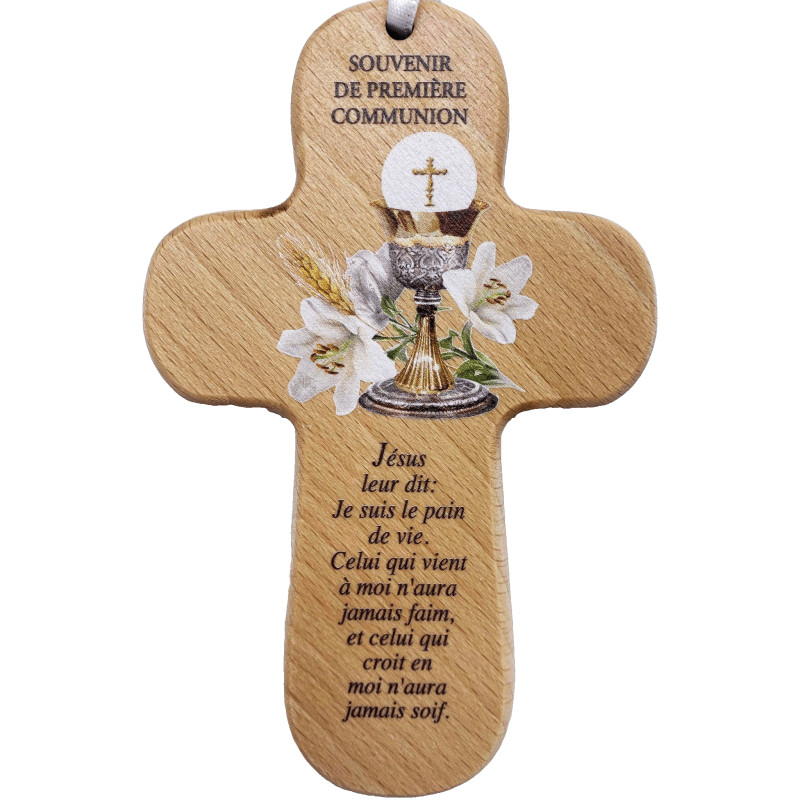 Cette croix "première communion" en bois véritable mesure 15cm de hauteur et est munie d'un cordon en tissu pour une accroche facile. L'impression couleur sur la croix lui donne un aspect décoratif et élégant qui s'intégrera parfaitement dans la chambre de l'enfant. Offrez cette croix en bois comme souvenir mémorable de la première communion d'un enfant.