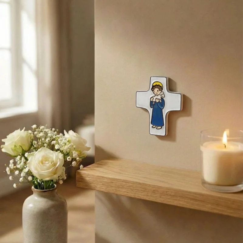 Fabriquée avec soin de manière artisanale en Europe, cette croix présente des détails délicats et des couleurs douces qui évoquent la tendresse du message chrétien. Le garçon portant l’agneau symbolise la pureté et l’amour divin.