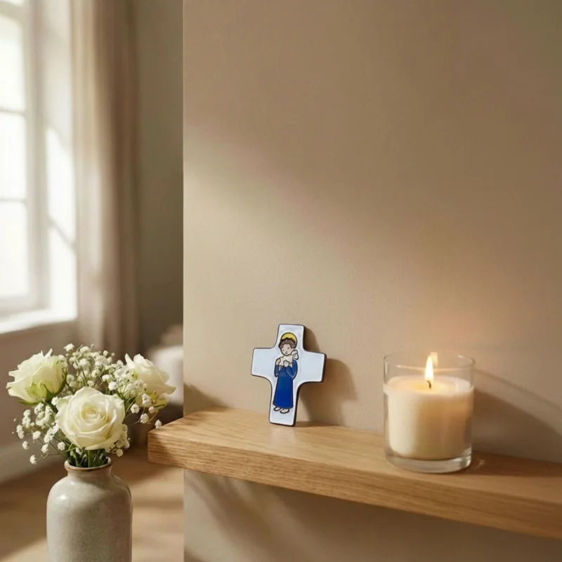 Offrez cette magnifique croix en céramique représentant un petit garçon et l'Agneau de Dieu. Parfaite pour un baptême, une communion ou simplement pour décorer une chambre d’enfant, cette croix incarne l’innocence, la foi et la paix.