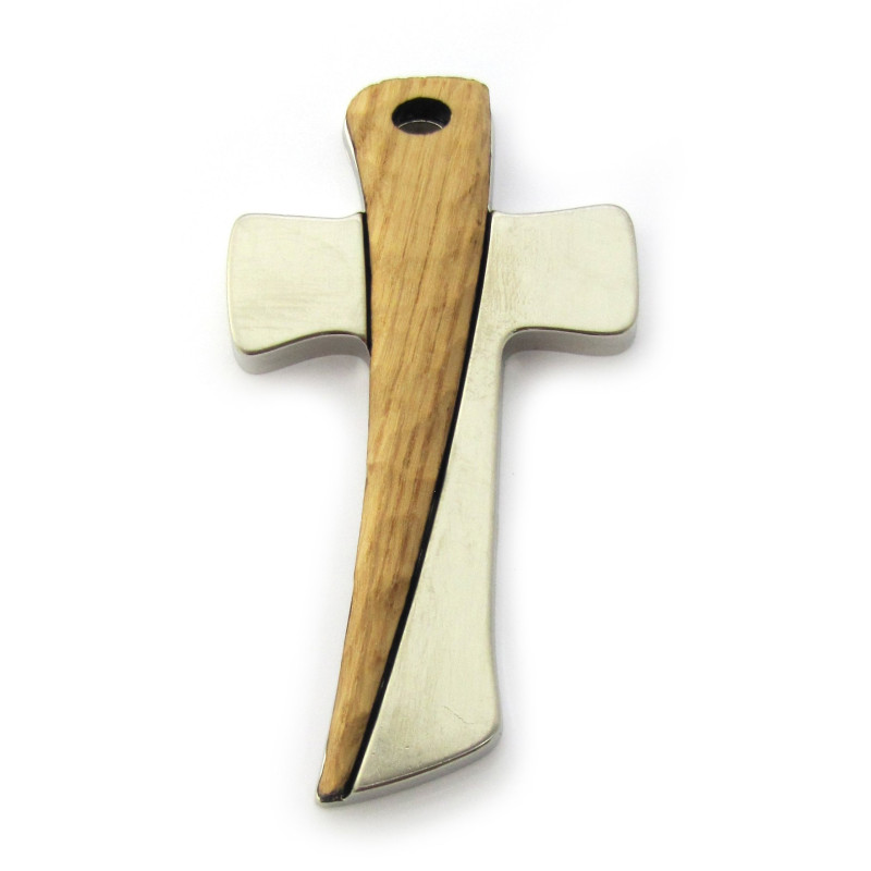Belle croix en bois et métal. Cette croix moderne mesure : 9.5cm x 5.5cm. Elle peut être accrochée au mur très facilement.
