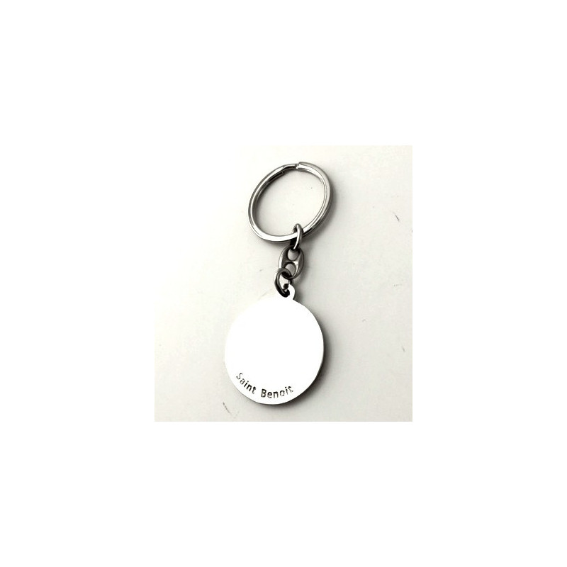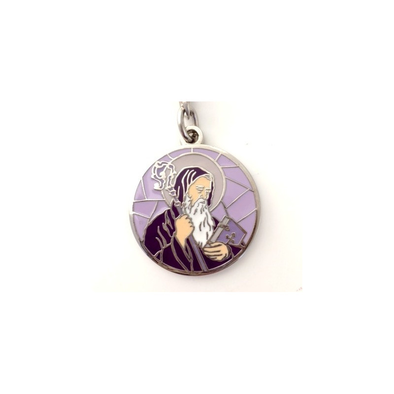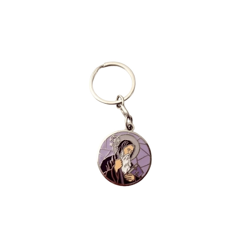 Porte-clefs St Christophe, patron de la chrétienté, argenté émaillé violet. Le diamètre de ce porte clé saint christophe est de 4 cm.