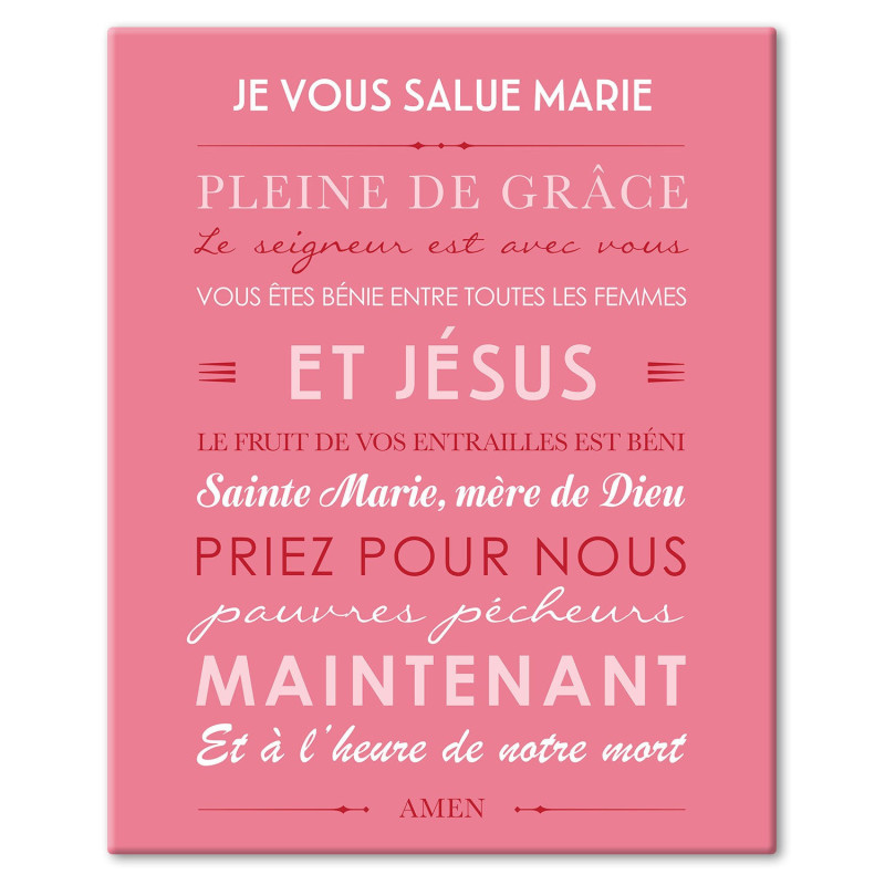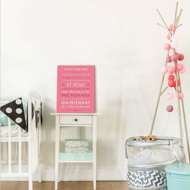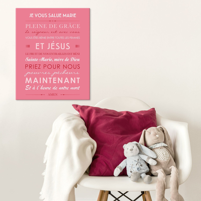 Cadre déco impression sur toile avec la prière "Je vous salue Marie" - rose. A poser ou à accrocher. Fabriqué en France par un petit atelier. Format 33x41 cm.