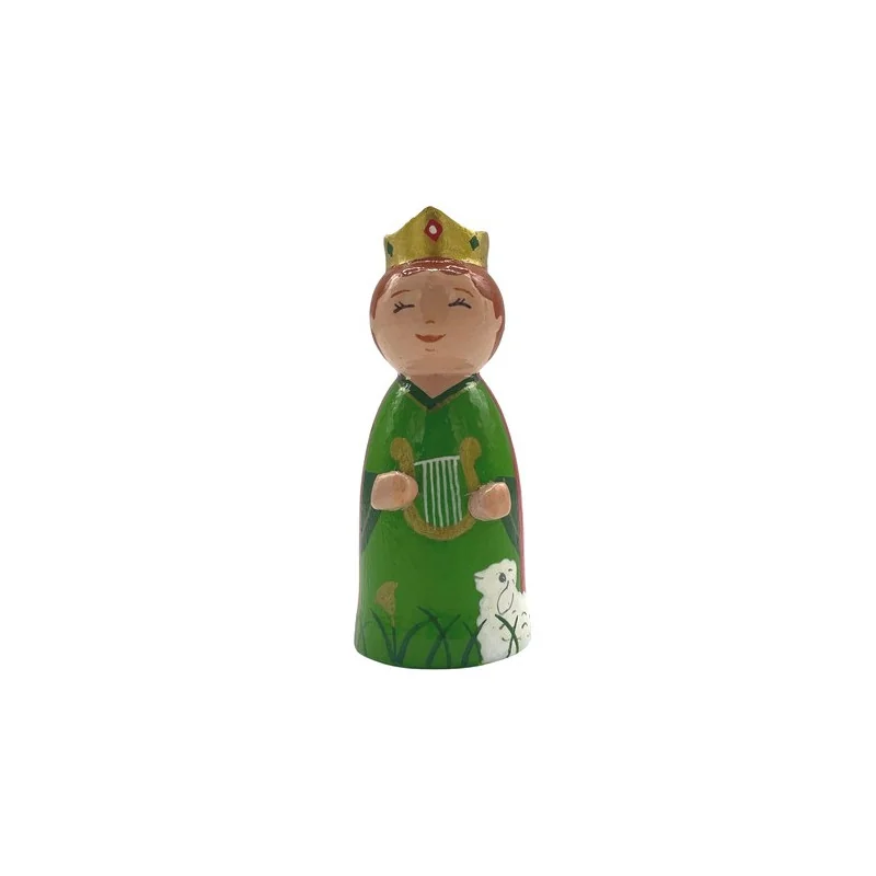Ici, David, vêtu de vert et rouge, il porte une couronne pour rappeler que c'est un roi !