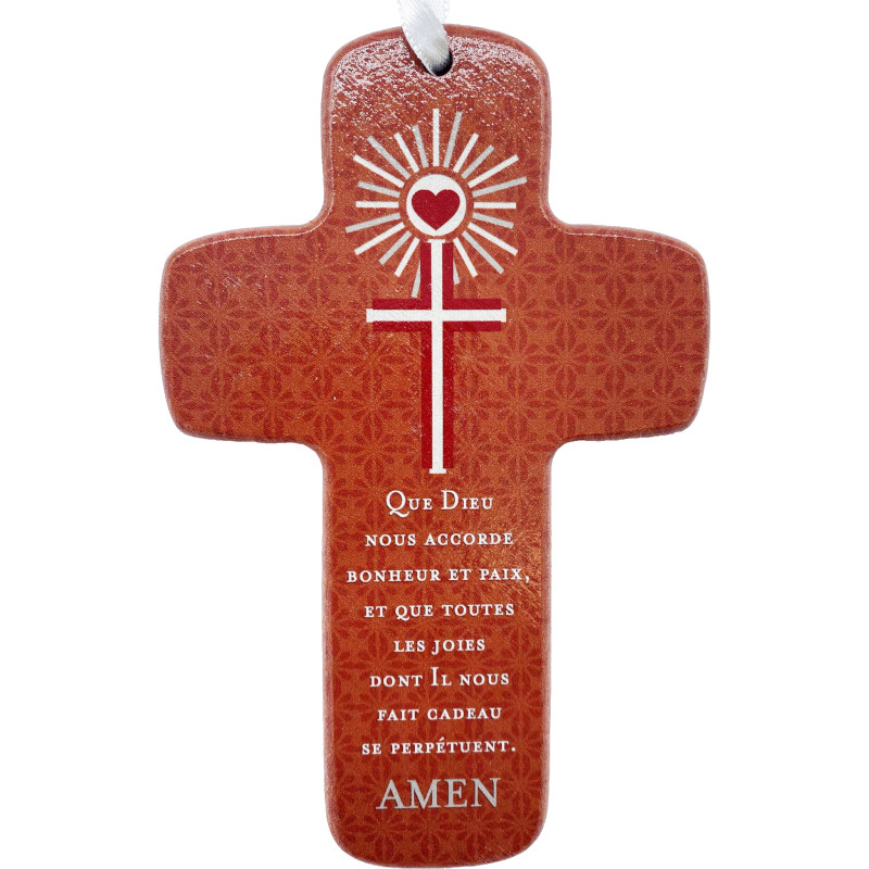 Croix moderne en bois véritable avec une impression couleur sur le thème de croix. 15cms de hauteur, ruban en tissu pour l'accroche.