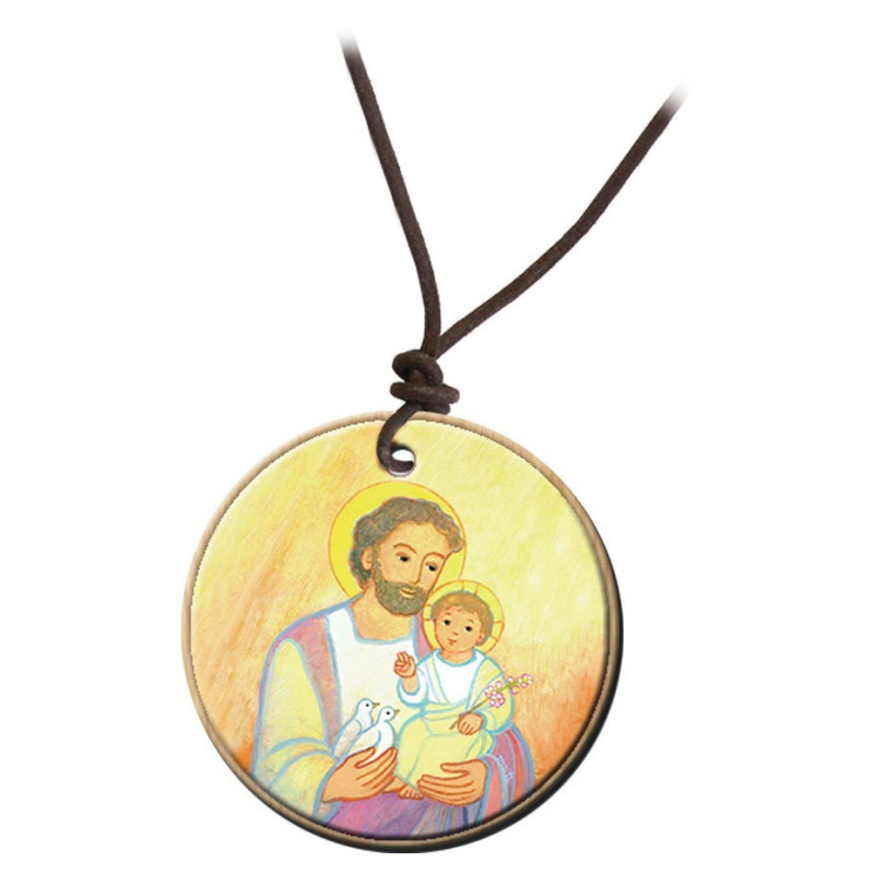 Joli pendentif en bois imprimé représentant Saint Joseph, dessiné par la célèbre illustratrice Maïte Roche.