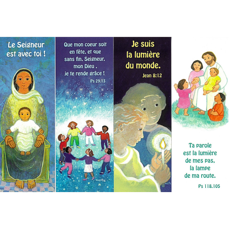 Retrouvez dans ce lot un ensemble 12 signets religieux, composé de 4 images (4x3) illustrées par la célèbre Maïte Roche. A offrir aux invités à l'occasion d'un baptême.