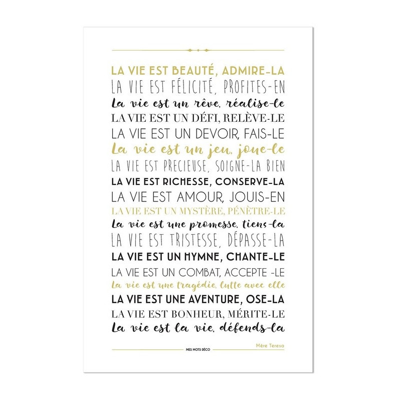 Pancarte déco en dibon blanc avec la prière de Mère Térésa, "la vie est beauté".