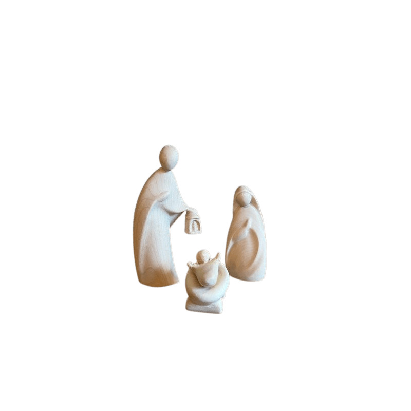 Superbe crèche en bois naturel représentant la nativité : Marie, Jésus, Joseph.