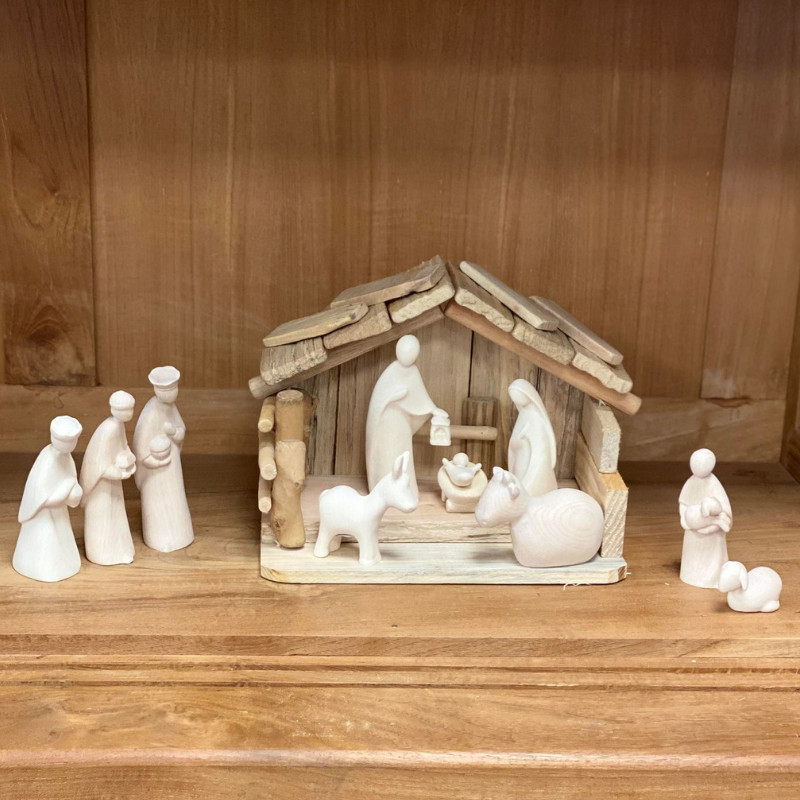 Superbe crèche de Noël en bois naturel - Artisanal, elle est entièrement sculptée à la main. Produit réalisé dans les Alpes italiennes. 10 personnages forment cette crèche.