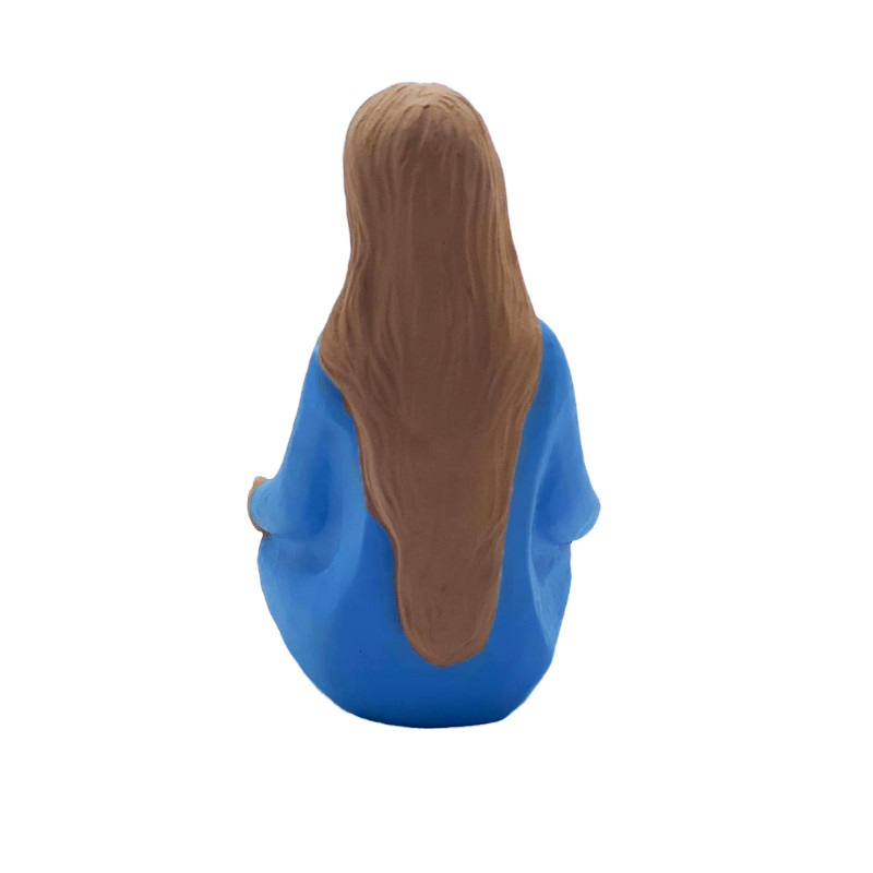 Ici, Marie est représentée, vêtue d'une longue robe bleue, assise en tailleur, les bras ouverts pour accueillir le Divin enfant sur elle, sous sa protection.