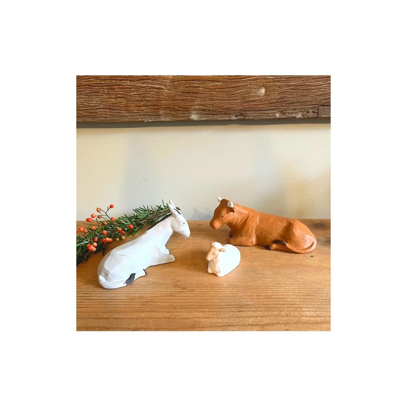 L'âne, indissociable du bœuf, est toujours posé à côté de Marie, Jésus et Joseph dans l'étable. L'âne et le bœuf nous rappellent que le Divin enfant est né dans la pauvreté et la modestie, dans leur étable. Par leur proximité avec la mangeoire, ils réchauffent l'Enfant Jésus tout juste né.
