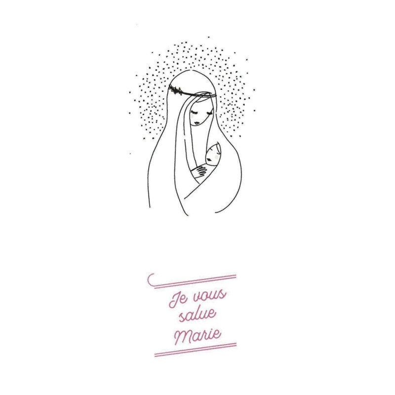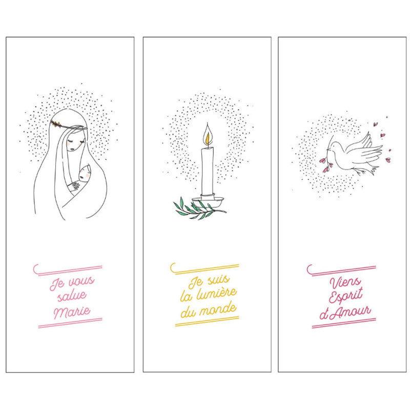 Superbes signets de baptême de la collection "Au fil de la plume". 3 illustrations montrant la Vierge Marie à l'enfant, l'Esprit Saint et la lumière.