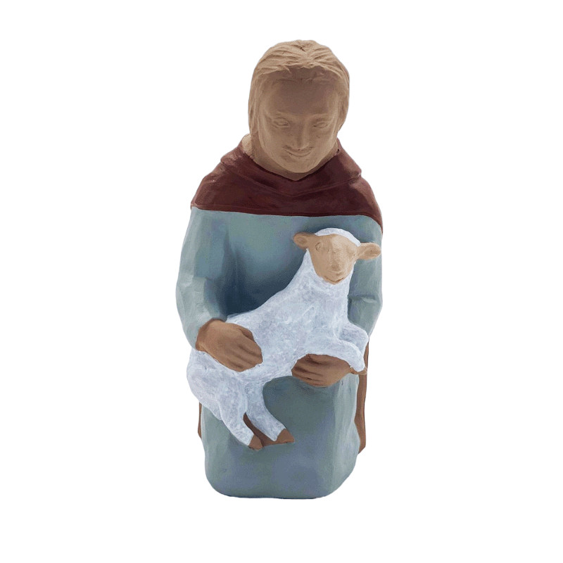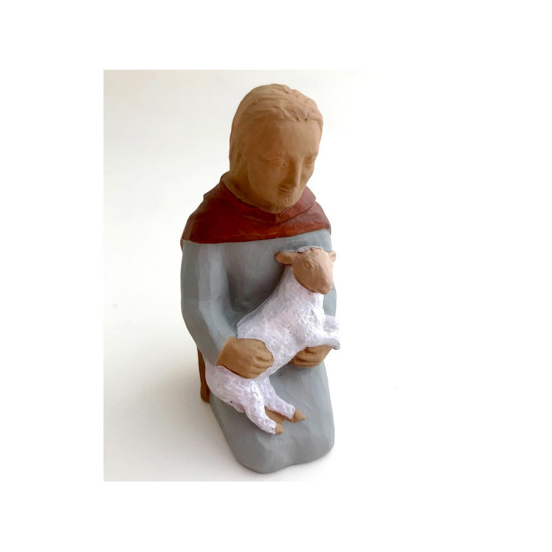 Ce berger est lui aussi à genoux, un mouton dans les bras. Il est incliné pour remercier et rendre grâce pour cette naissance divine. Les bergers sont les premiers à être arrivés dans l'étable pour la naissance de l'enfant Jésus.
