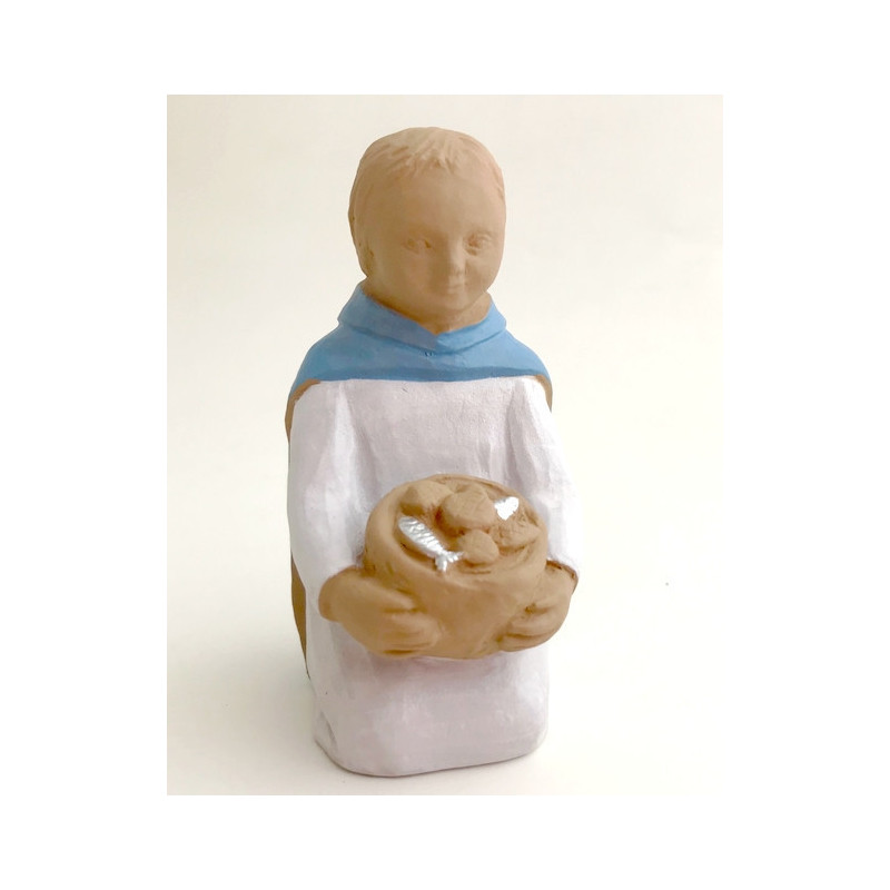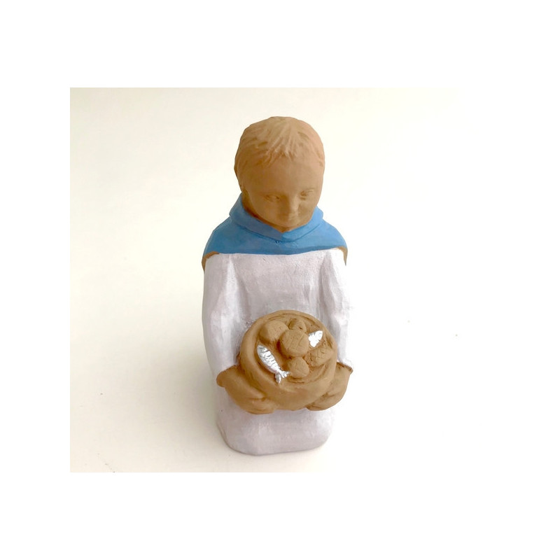 Comme les rois mages qui apportent des cadeaux, ce petit enfant est incliné devant l'enfant Jésus, Marie et Joseph et offre pains et poissons. Une forme de remerciements sincères.