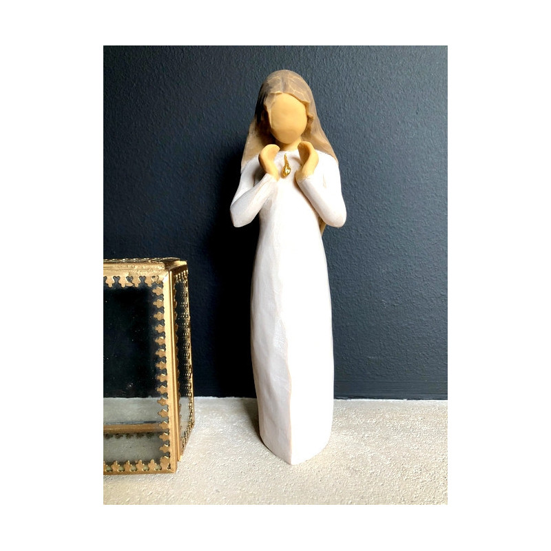 La statue Ne m'oublie jamais de Willow Tree, imaginée par Susan Lordi, exprime un attachement intime et durable. Sculptée à la main en résine et finement peinte, elle mesure environ 13,5 cm de hauteur. La figure féminine debout, en robe claire, tient contre sa poitrine un petit cœur doré, geste simple et fort, symbolisant la mémoire, la présence et l’amour persistant.
