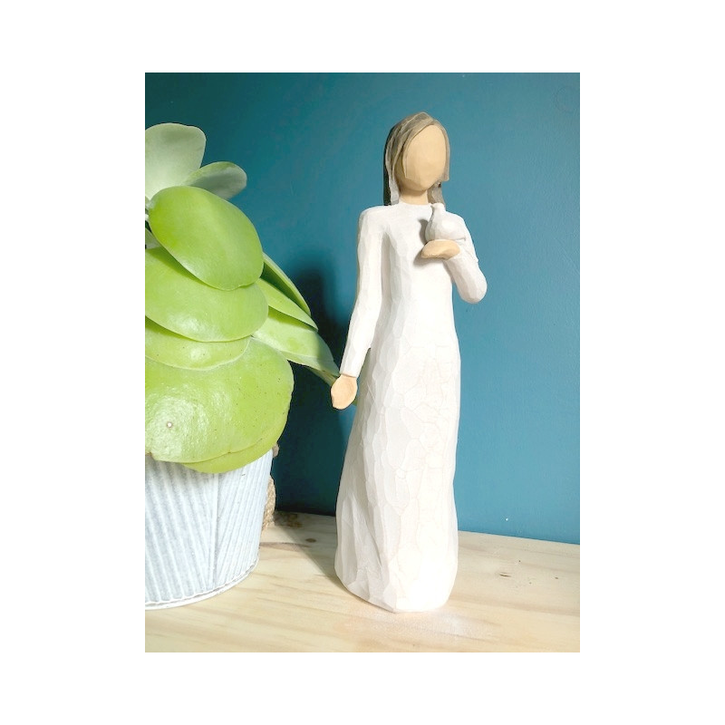 La statue With Sympathy de Willow Tree, créée par Susan Lordi, incarne un message de paix et de sérénité. Sculptée à la main en résine et peinte avec soin, elle mesure environ 23 cm de hauteur. La figure féminine, en robe crème, tient une colombe blanche dans sa main, symbolisant la beauté intérieure et la paix.